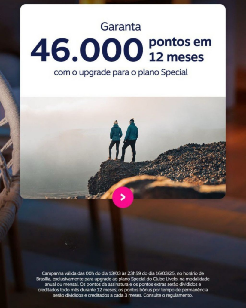 A Livelo está com uma promoção para quem deseja migrar para o Clube Special, no qual está oferecendo 20 mil pontos bônus aos clientes no upgrade do Clube na modalidade mensal ou anual. Os pontos serão distribuídos ao longo de 12 meses, e a oferta é válida até dia 16 de março. Confira todos os detalhes abaixo!