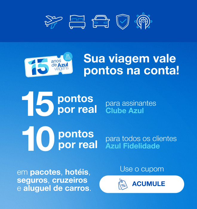Em comemoração aos 15 anos do Azul Viagens, o programa Azul Fidelidade está oferecendo até 15 pontos por real gasto em pacotes de viagem, hospedagens, seguros, cruzeiros e aluguel de carros. Vamos aos detalhes!