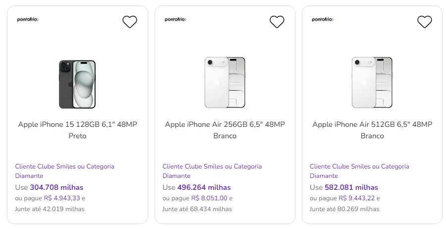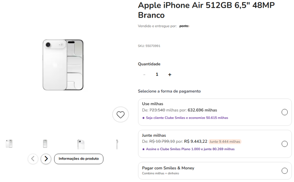 Na compra do iPhone Air 512 GB abaixo, considerando a pontuação base (8,5 milhas), é possível acumular 80.269 milhas Smiles nesta promoção. Já os assinantes do Clube 20.000 ou Clientes Diamante recebem 94.432 milhas Smiles (10 milhas).