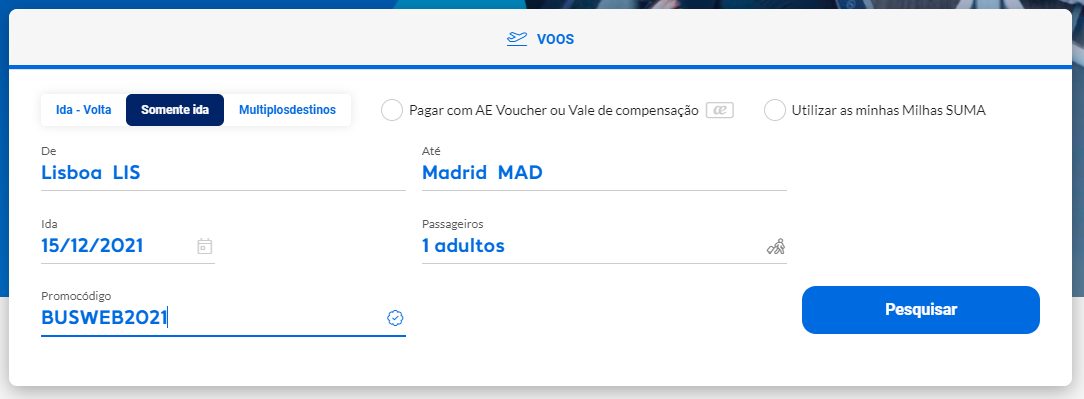 Vamos assumir, por exemplo, um voo entre Lisboa e Madrid em 15 de dezembro de 2021.