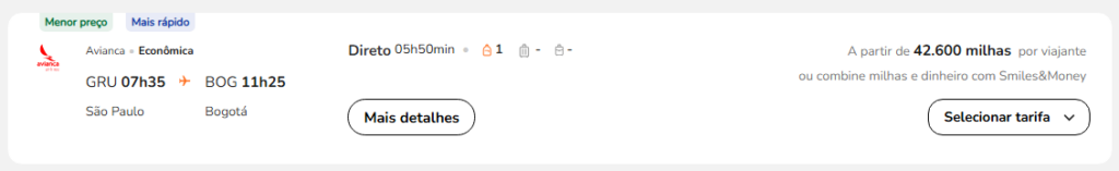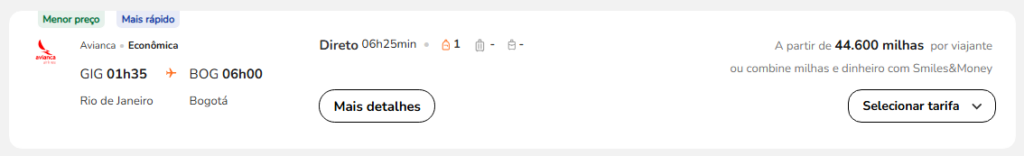 | Rio de Janeiro (GIG) | Bogotá (BOG) | Avianca | 44.600 | 47.000 | 18 de setembro | Reserve aqui |