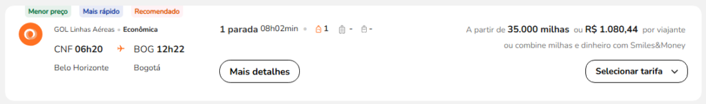 | Belo Horizonte (CNF) | Bogotá (BOG) | GOL | 35.000 | 39.000 | 11 de setembro | Reserve aqui |