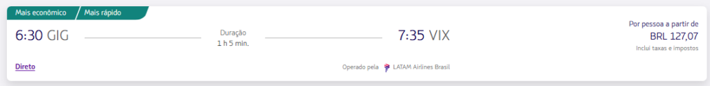| Rio de Janeiro (GIG) | Vitória (VIX) | R$ 127,07 | São Paulo (GRU) | Juiz de Fora (IZA) | R$ 182,04 |