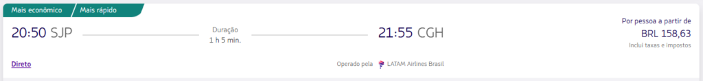 | São Paulo (CGH) | Ribeirão Preto (RAO) | R$ 173,04 | São José do Rio Preto (SJP) | São Paulo (GRU) | R$202,30 |