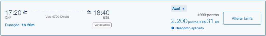 | Belo Horizonte (CNF) | Brasília (BSB) | Azul Fidelidade | 2.200 | 4.000 | 20 de maio | Reserve aqui |