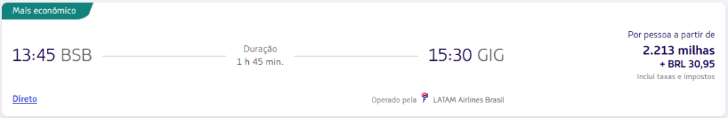 | Brasília (BSB) | Rio de Janeiro (GIG) | LATAM Pass | - | 2.213 | 1 de junho | Reserve aqui |