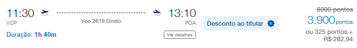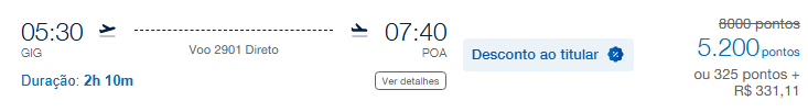 | Rio de Janeiro (GIG) | Porto Alegre (POA) | 5.900 | 8.000 | 19 de maio | Reserve aqui |