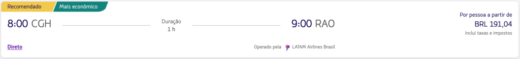 | São Paulo (CGH) | Ribeirão Preto (RAO) | R$ 191,04 | Macapá (MCP) | Belém (BEL) | R$ 317,82 |