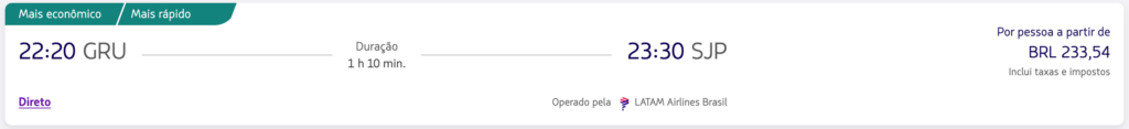 | Porto Alegre (POA) | Florianópolis (FLN) | R$ 280,36 | São Paulo (GRU) | Joinville (JOI) | R$ 376,54 |