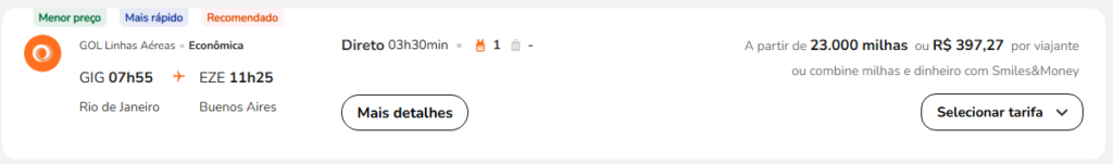 | Rio de Janeiro (GIG) | Buenos Aires (EZE) | GOL | 23.000 | 25.000 | 02-Junho | Reserve aqui |