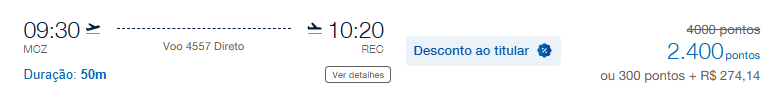 | Rio de Janeiro (GIG) | Recife (REC) | 9.100 | 10.000 | 13-Maio | Reserve aqui |