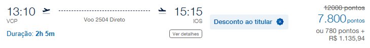 | Campinas (VCP) | Ilhéus (IOS) | 7.800 | 12.000 | 17 de maio | Reserve aqui |