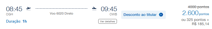 Confira na tabela a seguir trechos a partir de 2.600 pontos. Para pesquisar outros destinos, acesse esta página.