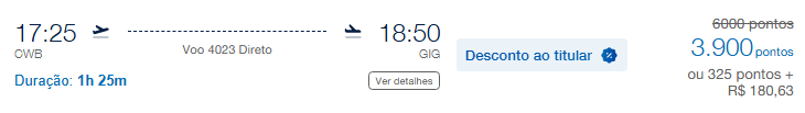 | Curitiba (CWB) | Rio de Janeiro (GIG) | 3.900 | 6.000 | 27 de maio | Reserve aqui |