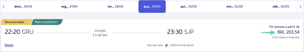 | São Paulo (GRU) | São José do Rio Preto (SJP) | R$ 203,54 | Campinas (VCP) | Brasília (BSB) | R$ 322,22 |