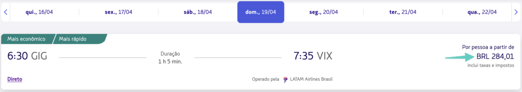 | Rio de Janeiro (GIG) | Vitória (VIX) | R$ 284,01 | São Paulo (GRU) | Juiz de Fora (IZA) | R$ 433,54 |
