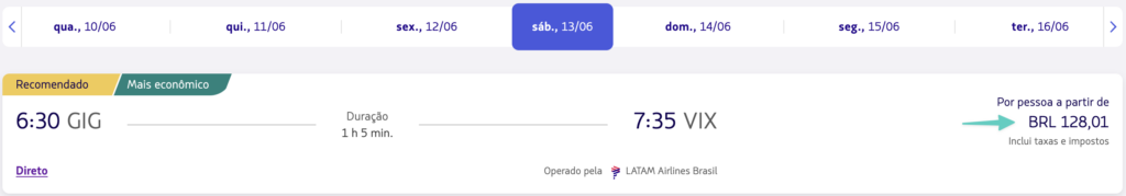 | Rio de Janeiro (GIG) | Vitória (VIX) | R$ 128,01 | Florianópolis (FLN) | Porto Alegre (POA) | R$ 256,86 |