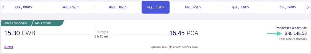 | Curitiba (CWB) | Porto Alegre (POA) | R$ 148,53 | Brasília (BSB) | Rio de Janeiro (SDU) | R$ 263,77 |
