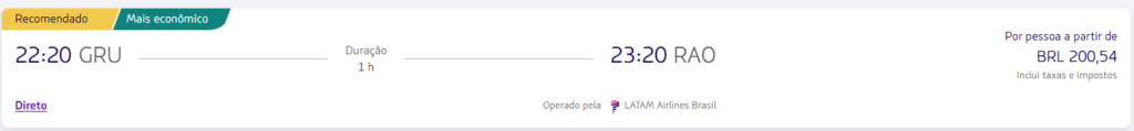 | São Paulo (GRU) | Ribeirão Preto (RAO) | R$ 200,54 | São Paulo (CGH) | Rio de Janeiro (SDU) | R$ 274,04 |