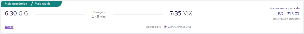 | São Paulo (GRU) | Uberaba (UBA) | R$ 271,54 | São Paulo (GRU) | Vitória (VIX) | R$ 356,54 |