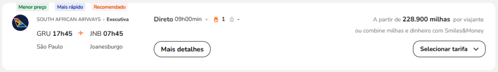 | São Paulo (GRU) | Cidade do Cabo (CPT) | South African Airways | 195.400 | 202.000 | 27-Maio | Reserve aqui |