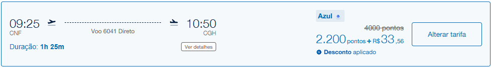| Belo Horizonte (CNF) | São Paulo (CGH) | Azul Fidelidade | 2.200 | 4.000 | 23 de setembro | Reserve aqui |