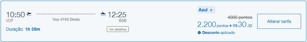 | Campinas (VCP) | Brasília (BSB) | Azul Fidelidade | 2.200 | 4.000 | 28 de maio | Reserve aqui |