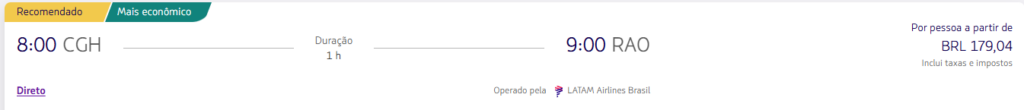 | São Paulo (CGH) | Ribeirão Preto (RAO) | R$ 179,04 | Belém (BEL) | Macapá (MCP) | R$ 252,35 |