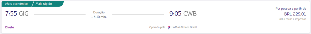 | Rio de Janeiro (GIG) | Curitiba (CWB) | R$ 229,01 | São Paulo (GRU) | Palmas (PMW) | R$ 262,54 |