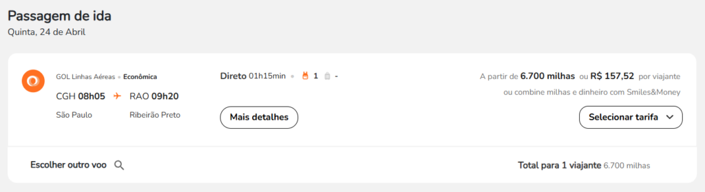 Abaixo você confere um exemplo de emissão partindo de São Paulo – Congonhas, com destino a Ribeirão Preto por 6.700.000 milhas Smiles. Emita essa passagem aqui.