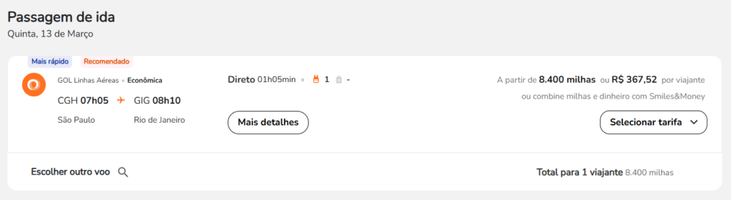 | São Paulo (CGH) | Rio de Janeiro (GIG) | 8.400 | 10.400 | Reserve aqui |