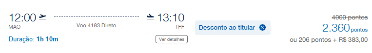 Disponibilidade encontrada pelo site da Azul por 4.000 pontos para todos os clientes ou 2.360 pontos para clientes Diamante. Emita essa passagem aqui.