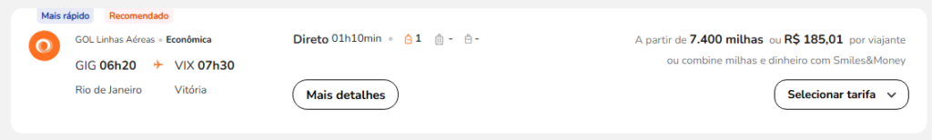 | Rio de Janeiro (GIG) | Vitória (VIX) | 7.400 | 9.000 | 2 de maio | Reserve aqui |