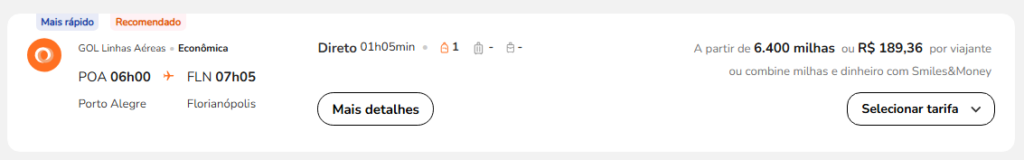 | Florianópolis (FLN) | Porto Alegre (POA) | 6.400 | 7.800 | 29 de maio | Reserve aqui |