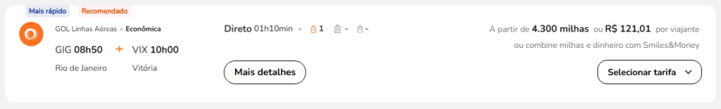 | Rio de Janeiro (GIG) | Vitória (VIX) | 7.400 | 9.000 | 2 de maio | Reserve aqui |