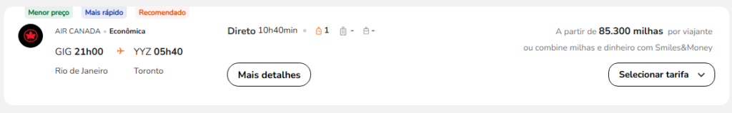 | Rio de Janeiro (GIG) | Toronto (YYZ) | Air Canada | 85.300 | 90.000 | 25 de novembro | Reserve aqui |