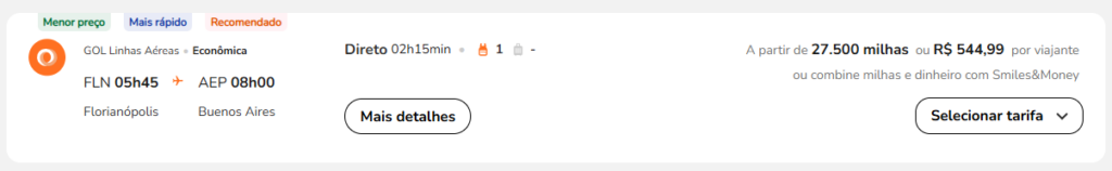 | Florianópolis (FLN) | Buenos Aires (AEP) | GOL | 27.500 | 30.000 | 08-Maio | Reserve aqui |