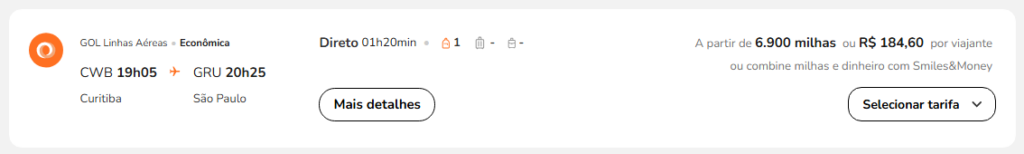 | São Paulo (GRU) | Curitiba (CWB) | 6.900 | 7.700 | 1° de junho | Reserve aqui |