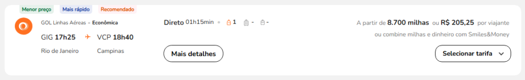 | Campinas (VCP) | Rio de Janeiro (GIG) | 8.700 | 9.700 | 18 de maio | Reserve aqui |
