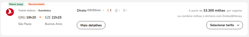 | São Paulo (GRU) | Buenos Aires (EZE) | Turkish Airlines | 33.300 | 35.000 | 3 de maio | Reserve aqui |