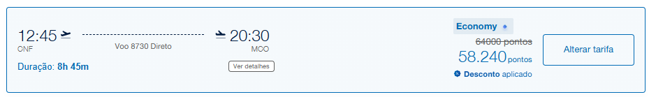 Disponibilidade encontrada por 54.600 pontos para clientes Diamante, ou 60.000 pontos para todos os clientes. Emita essa passagem aqui.