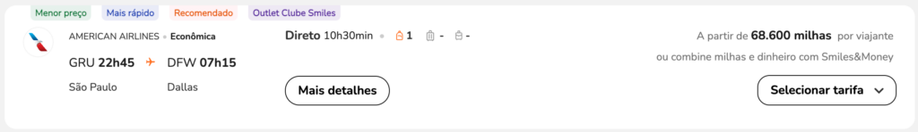 | São Paulo (GRU) | Dallas (DFW) | American Airlines | 68.600 | 81.000 | 27 de outubro | Reserve aqui |