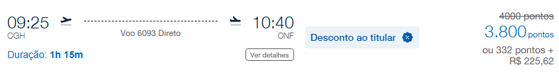 | Rio de Janeiro (GIG) | Belo Horizonte (CNF) | 5.700 | 6.000 | 31-Julho | Reserve aqui |