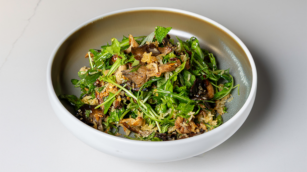 - Salada de cogumelos tostados, arroz crocante e molho furikake