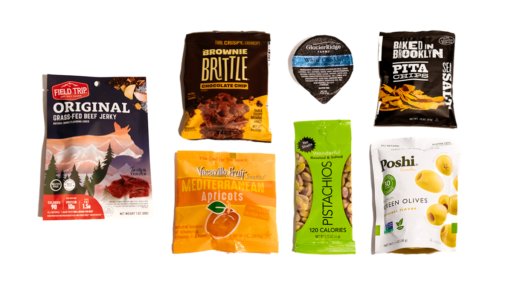 - Tarde: cookies de baunilha, chips de sal marinho, barras de aveia, puffs de couve-flor, pistache e jerky.