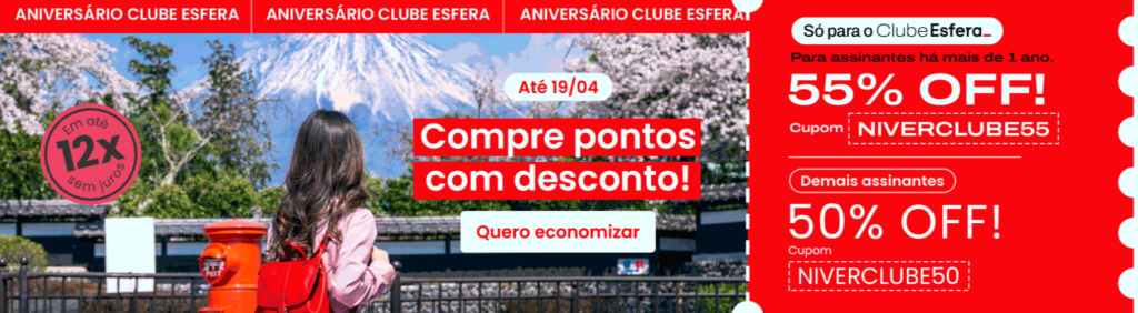Em comemoração ao aniversário do Clube Esfera, o programa está oferecendo aos seus clientes até 55% de desconto na compra de pontos. Abaixo, veja os detalhes desta oferta, válida até o dia 19 de abril, e aproveite!