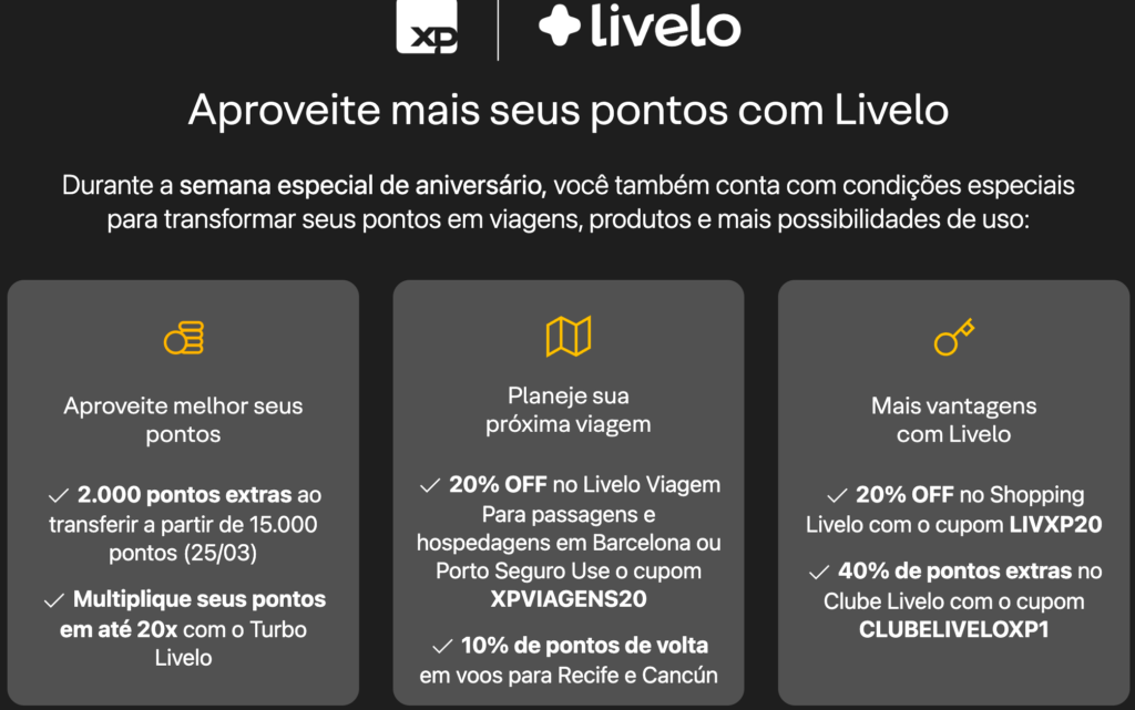 Com a XP lançando a campanha de aniversário com benefícios exclusivos, um dos destaques é a parceria com a Livelo, que oferece bônus de pontos e condições especiais aos clientes.