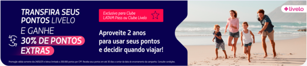 - 30% de bônus – Assinantes do Clube LATAM Pass e/ou Clube Livelo