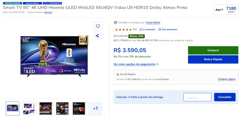 - Os clientes do Clube Azul acumulam 53.850 pontos na compra da Smart TV 65” Hisense abaixo;