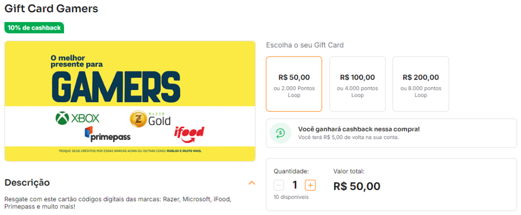 Siga o passo a passo para comprar o gift card “O Melhor Presente Para Gamers” e garantir 10% de cashback: